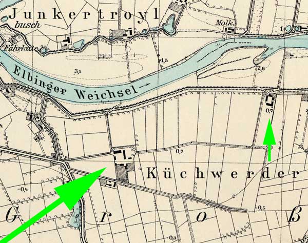 "Hof in Küchwerder an der Elbinger Weichsel genannt "Paradies" erbaut von Eduard Foth, dann Arthur Foth, dann von Johannes Wiens, Vater von Käte Dück geb. Wiens, gekauft. Dann von Gerhard W. Dück und Frau Käte erworben. 1928 - 1939 von Ernst Dück und Magdalena, geb. Foth, gepachtet."