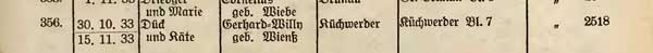 bzw. 15.11.1933 stellen Gerhard Willy Dück und Käthe Wiens bzgl.