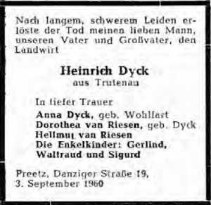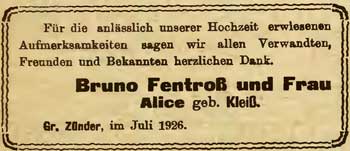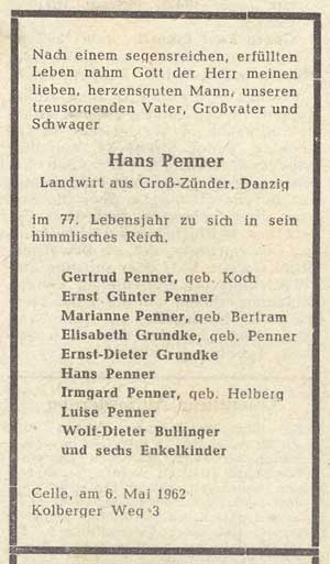 14.08.1885, † 1960 in Preetz, Krs Plön (Q: Unser Danzig, 1960/18)