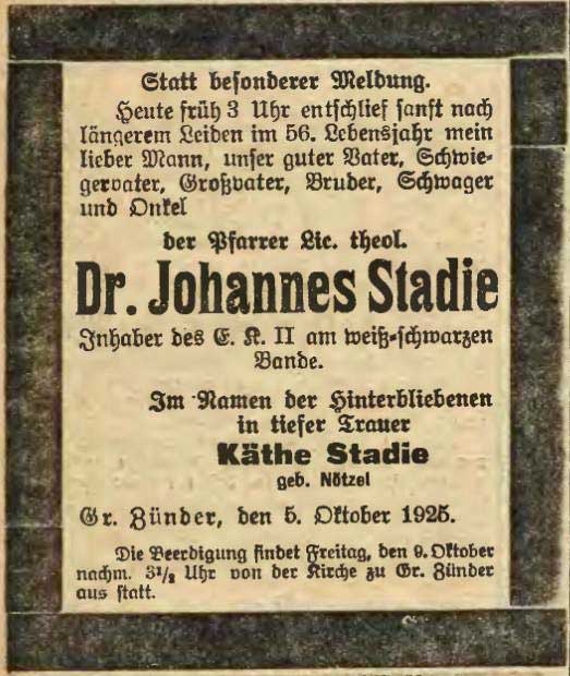 hier in Gr. Zünder am 5 October 1925 im Alter von 55 Jahren