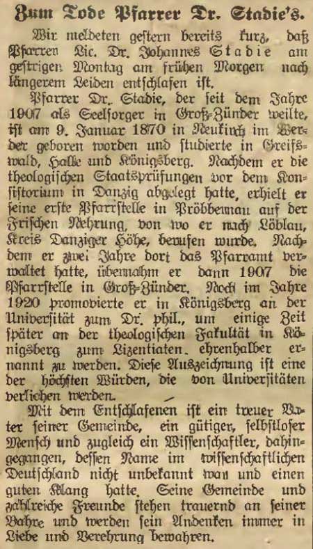 Berent wird er als "Prediger in Groß Zünder" bezeichnet. *