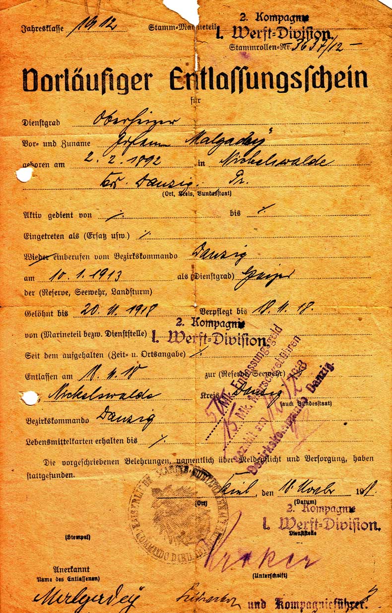 vom Militär vom 18.11.1918 des Johann Malgadey - eine Woche nach Eintritt des