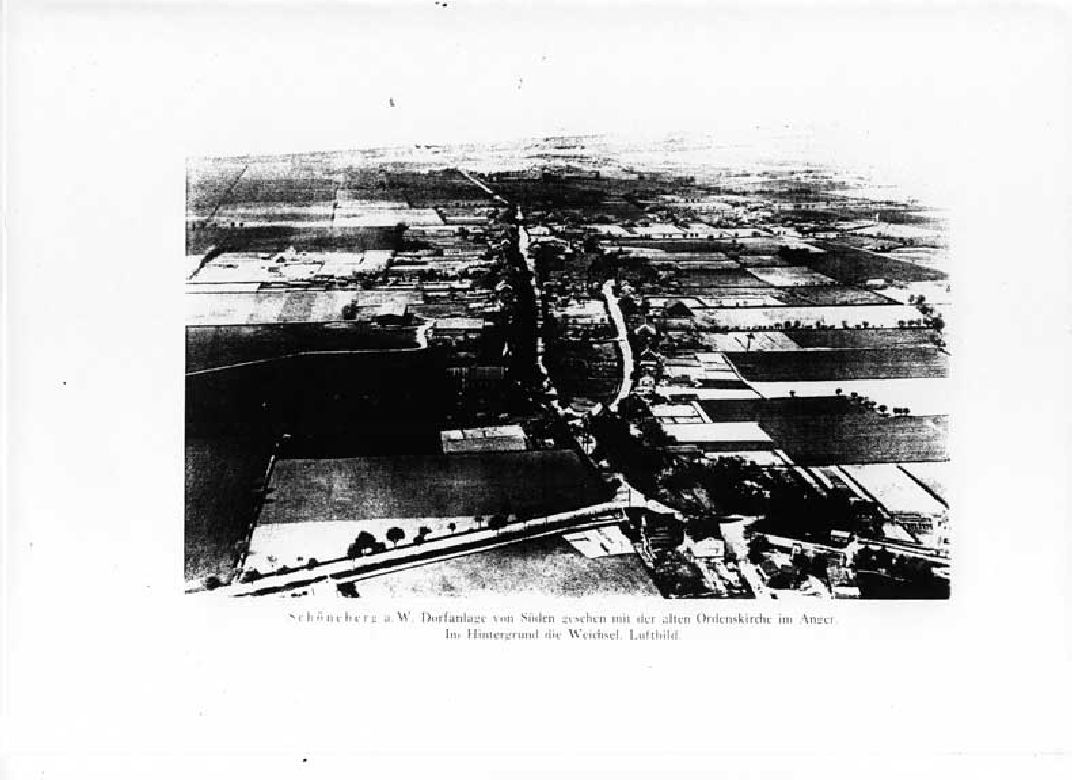 Schöneberg a.W. : Dorfanlage von Süden gesehen mit der alten Ordenskirche im Anger Im Hintergrund die Weichsel - Luftbild