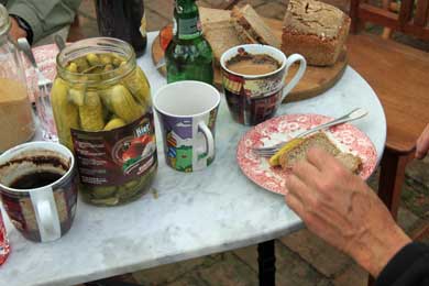 Gurken, Schinken, Brot und selbstgebrannten Wodka ziehen wir von dannen.