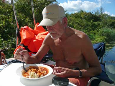 Wir legen ab, fahren 20 m ... der Motor stirbt ab. Anlassen, es tuckert,