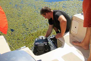 klettert aufs Boot, geht zum Motor, zieht einen Schlauch ab. Motor