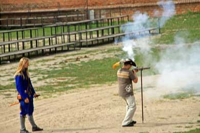 zum Teil in Phantasiebekleidung, der sich an einem Vorderlader zu